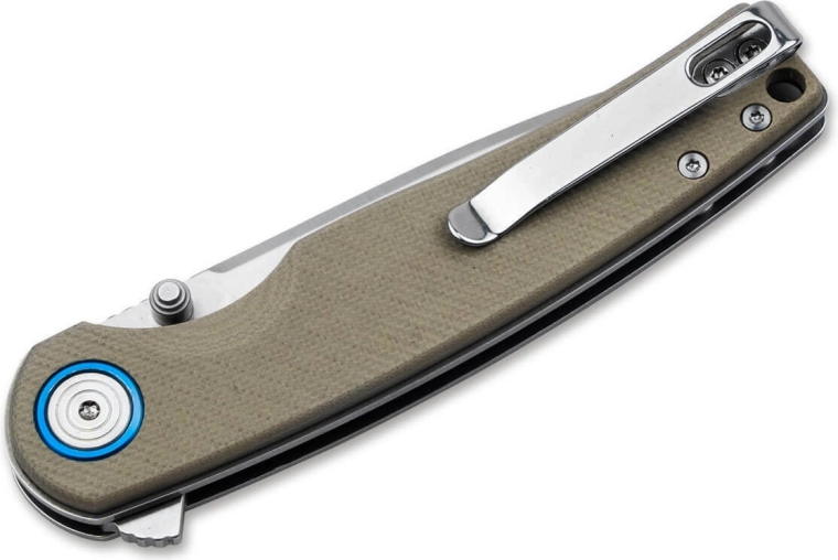Het ergonomisch gevormde G10-handvat in bruin biedt een zekere grip, ook onder zwaardere omstandigheden. De praktische uitrusting, inclusief flipper, dubbelzijdige duimpin en Linerlock-vergrendeling, verhoogt zowel de veiligheid als het gebruiksgemak. De blauw geaccentueerde pivotschroef geeft het mes een unieke uitstraling.