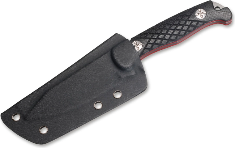 Het handvat van G10 met een antisliptextuur geïnspireerd op visschubben zorgt voor zekerheid in de hand, ook bij natte omstandigheden. Decoratieve rode lagen geven het mes een aantrekkelijke uitstraling. De praktische Kydex‑schede met riemadapter maakt comfortabel en veilig dragen mogelijk, zowel in het veld als in de stad.