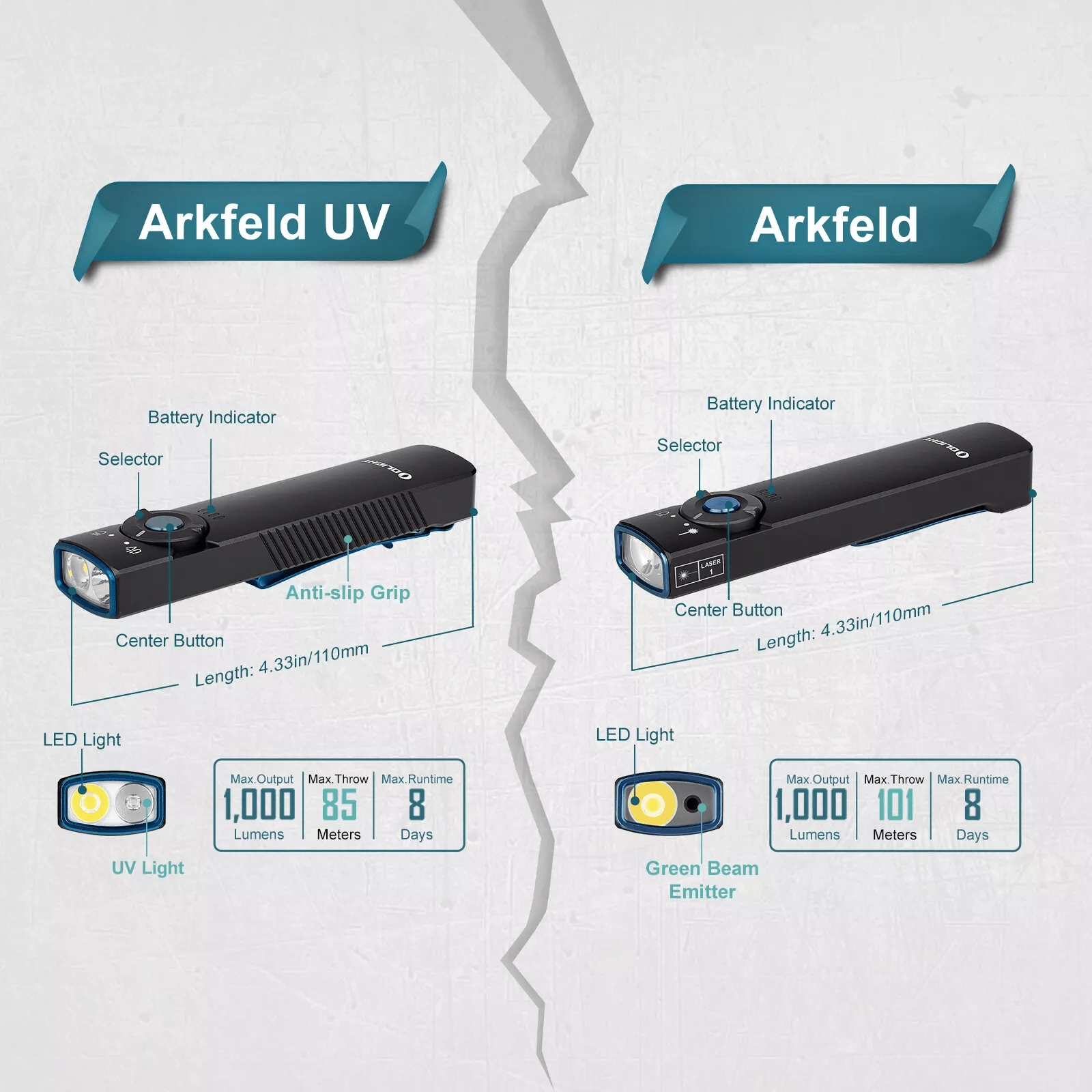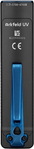 De OLIGHT Arkfeld UV is een EDC-zaklamp voor in de broekzak met een uniek plat ontwerp, die neutraal witte LED (4000–5000 K) voor dagelijks licht combineert met een UV-diode 365 nm (580 mW) voor controle van bankbiljetten, detectie van fluorescerende mineralen of hygiëne van oppervlakken. Het maximale bereik van het witte licht is 85 m en de piekoutput bedraagt 1.000 lm.