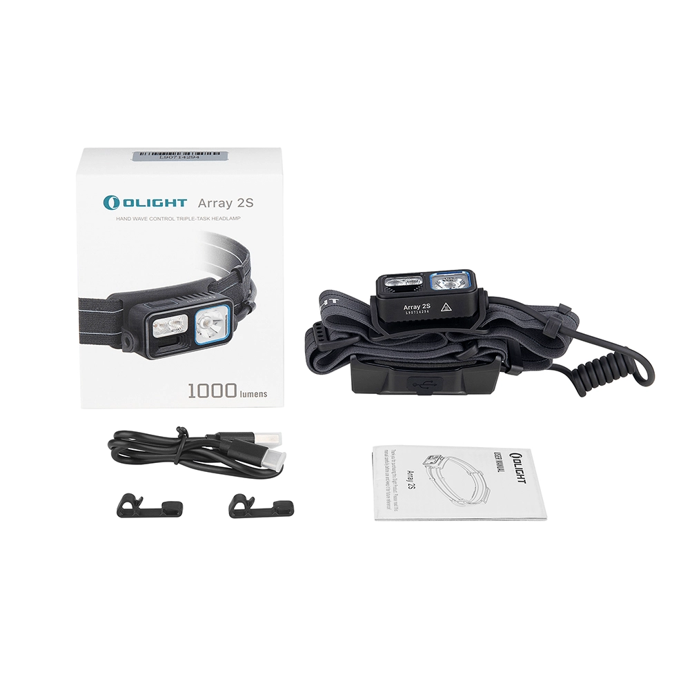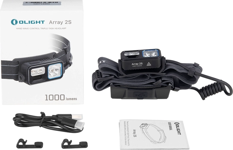 - Hoofdlamp Array 2S (hoofdband en batterijpack), USB‑C‑kabel, gebruikershandleiding