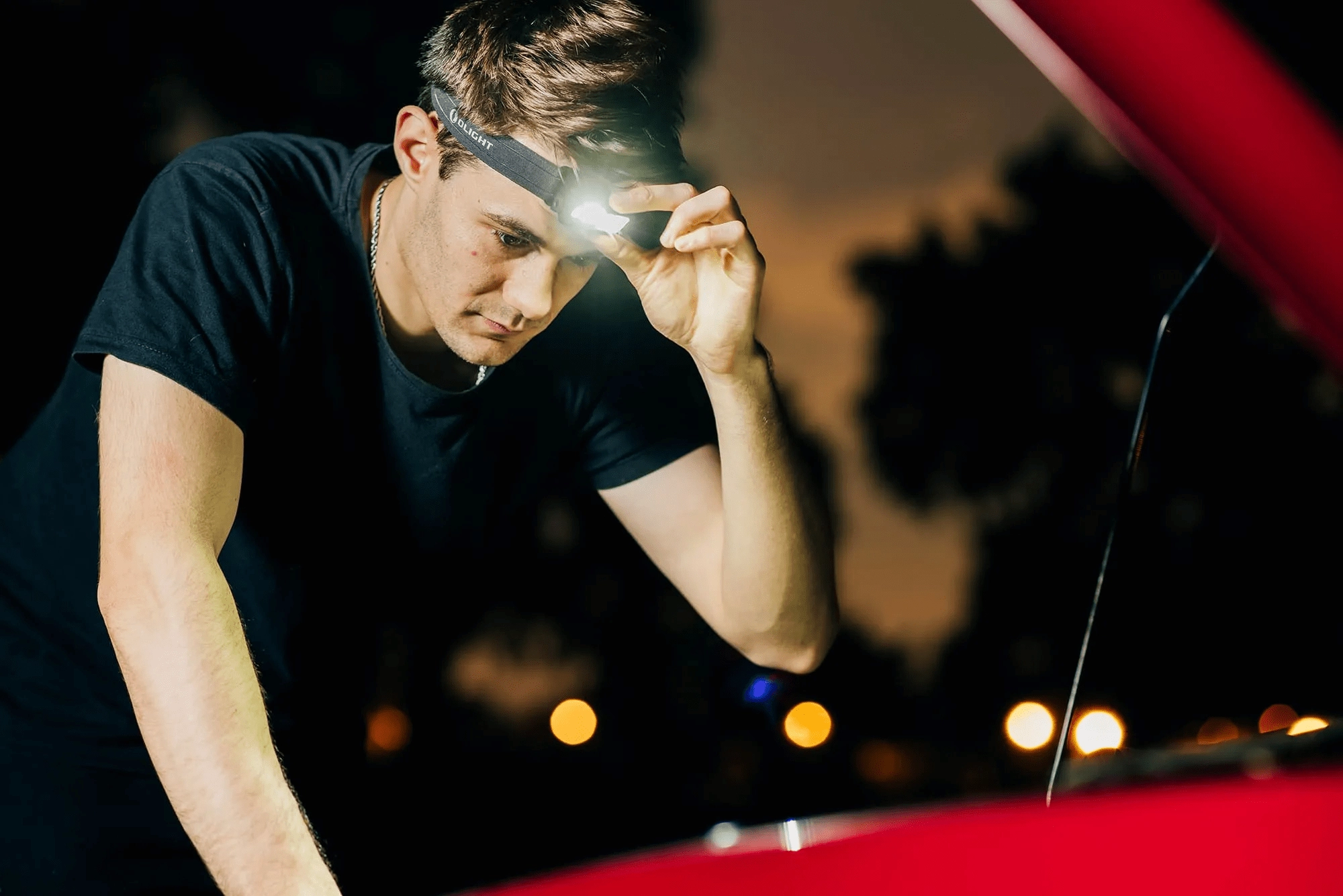 Lichte, zweetbestendige hoofdband met 60° kantelinstelling en een rood achterlicht op het batterijpack voor betere zichtbaarheid en veiligheid.