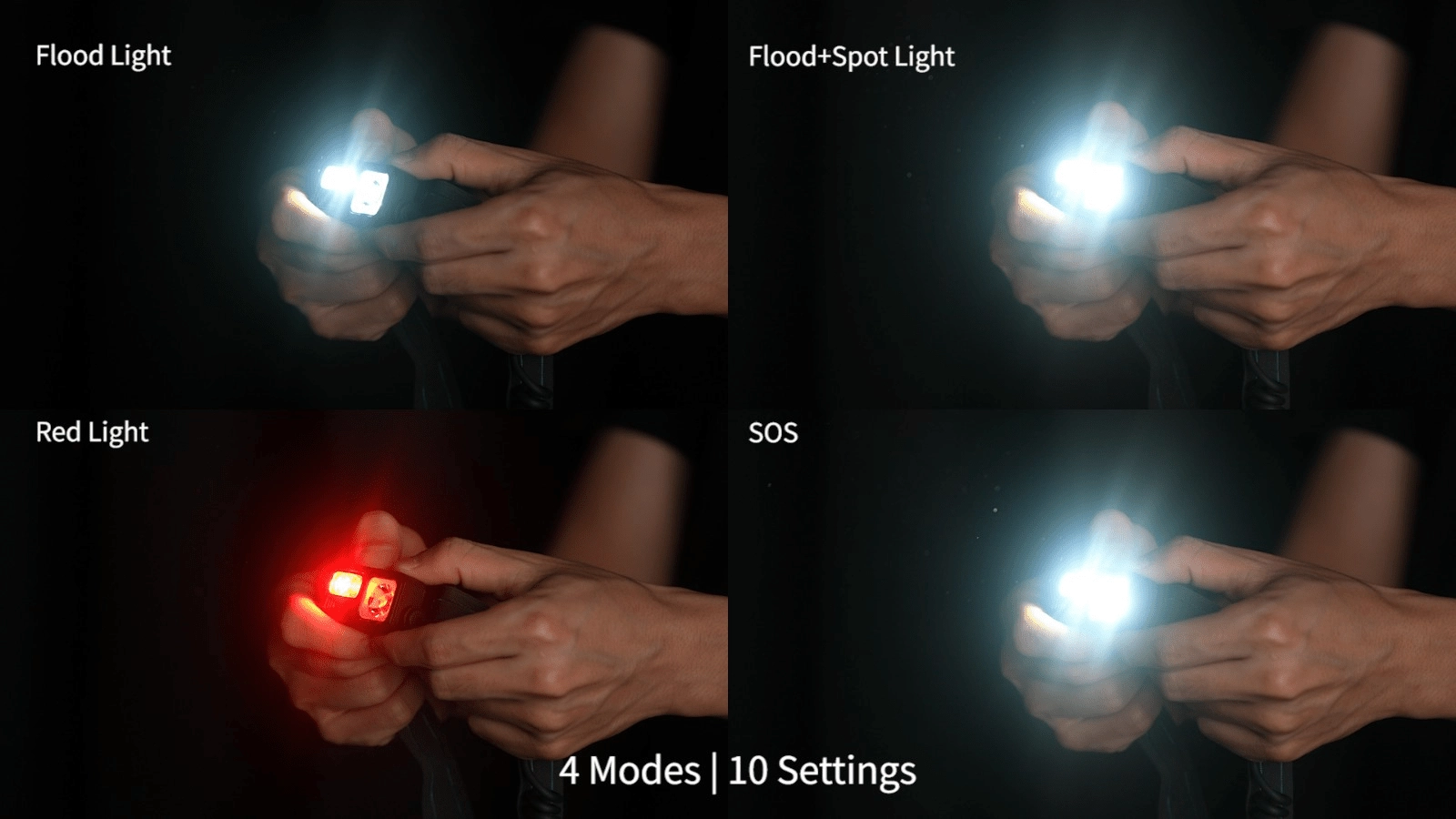 - 4 lichtstanden: flood, flood + spot, rood licht, SOS