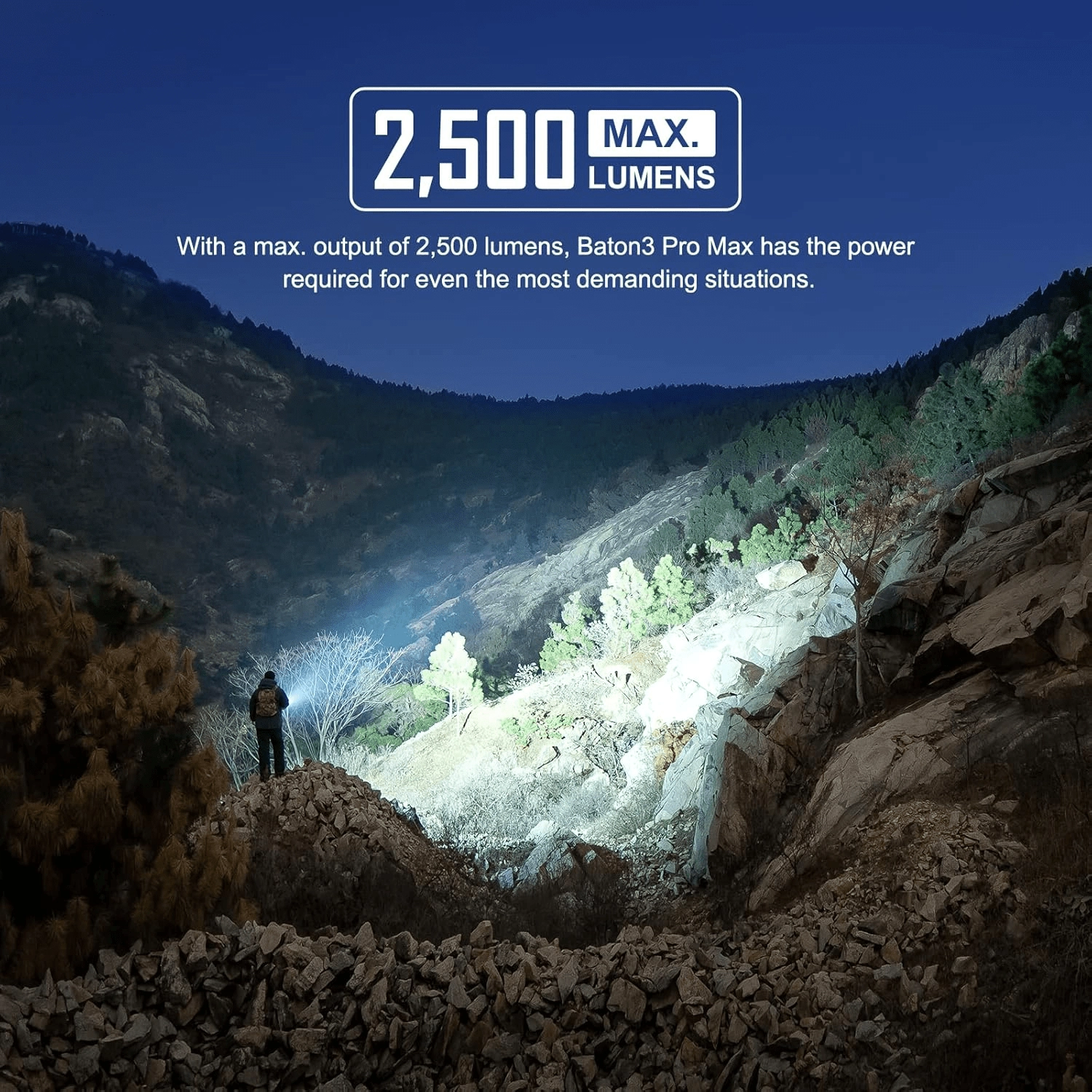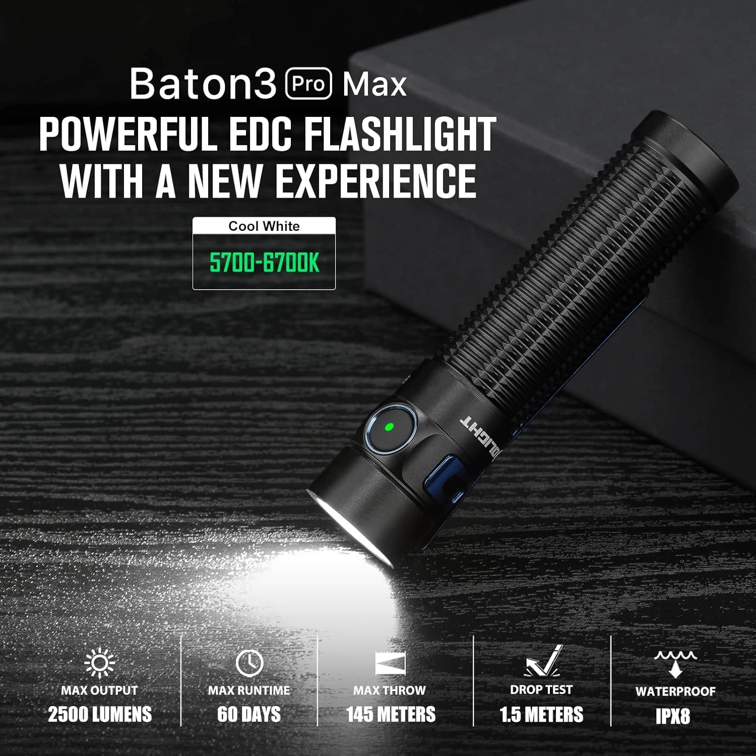 De OLIGHT Baton 3 Pro Max is een krachtige EDC-zaklamp die compacte afmetingen combineert met een maximale lichtopbrengst van 2500 lumen en een bereik tot 145 meter. Hij biedt vijf helderheidsniveaus, een speciale moonlight 1 lm voor nachtelijk gebruik en een stroboscoop voor noodgevallen. De grotere, licht verzonken knop met elektronisch slot minimaliseert onbedoeld inschakelen.