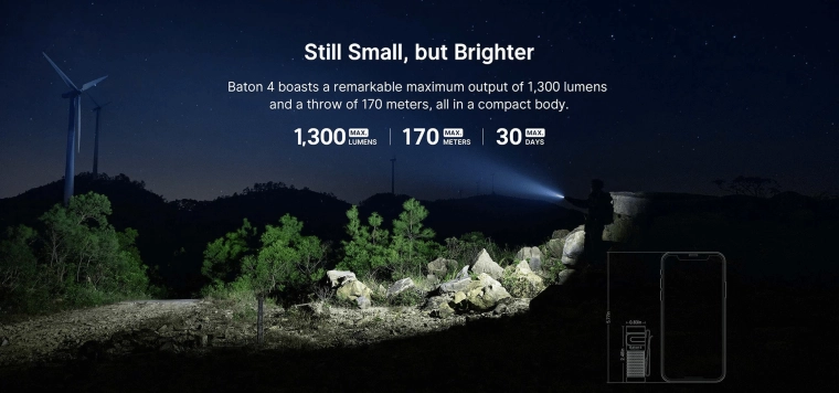 De compacte EDC-zaklamp OLIGHT Baton 4 Premium Edition levert tot 1300 lm lichtopbrengst, een bereik van 170 m en een premium draadloze oplaadcase met een capaciteit van 5000 mAh, die de lamp tot wel 5× kan opladen. Hij biedt vijf helderheidsniveaus, een stroboscoop, comfortabel zijbediening, een magnetische eindkap en een dubbelzijdige clip voor gemakkelijk dragen.