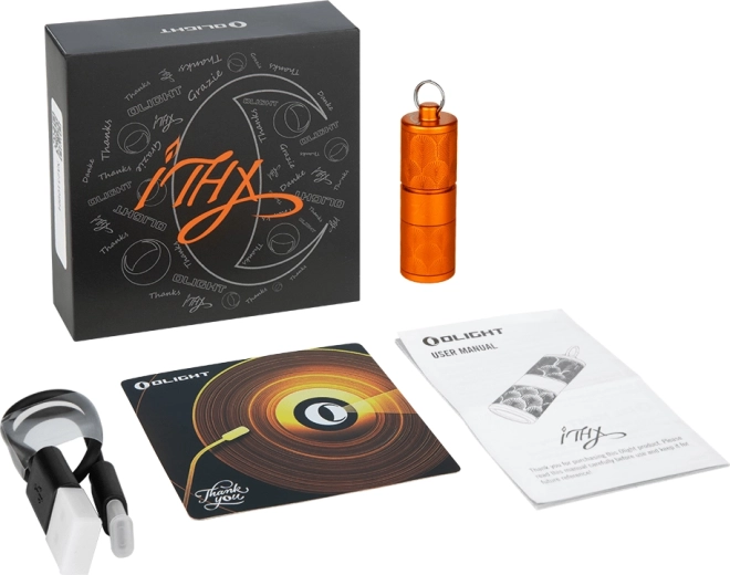 Ultracompacte sleutelhangerzaklamp Olight iTHX Orange Feathers biedt tot 180 lm, een bereik van 48 m en handig opladen via USB‑C. Dankzij de ingebouwde Li‑Ion accu van 130 mAh brandt hij tot 12 uur, heeft IPX8-bestendigheid en eenvoudige bediening door de kop te draaien.