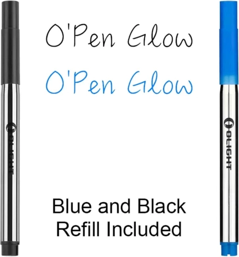 - O'Pen Glow (zwarte vulling), oplaadbasis, USB‑C‑kabel, blauwe vulling, magnetische badge, gebruikershandleiding