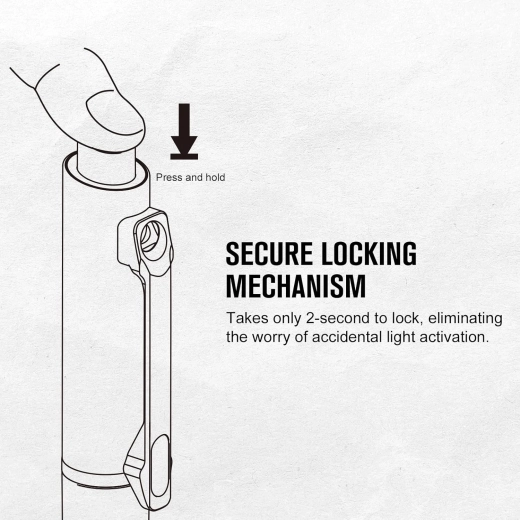 Licht AL6061‑T6 aluminium lichaam met getextureerde grip, zakclip en vergrendelingsfunctie voor veilig meenemen zonder ongewenste activatie.