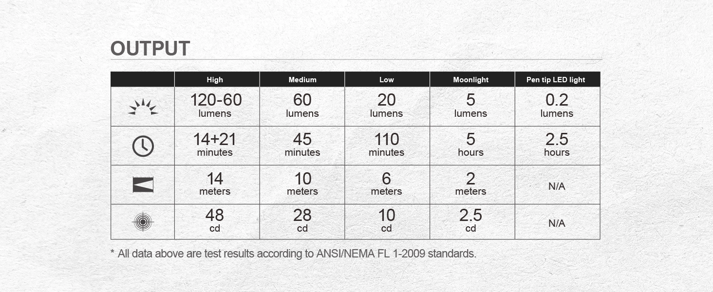 - Hoog: 120→60 lm (14 + 21 min), Middel: 60 lm (45 min), Laag: 20 lm (110 min), Moon: 5 lm (5 u)