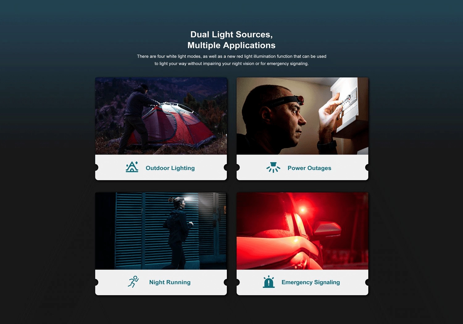 Vijf standen voor wit licht en een rode LED om nachtzicht te behouden of voor noodsignalen. Duidelijke batterij-indicator in drie kleuren.