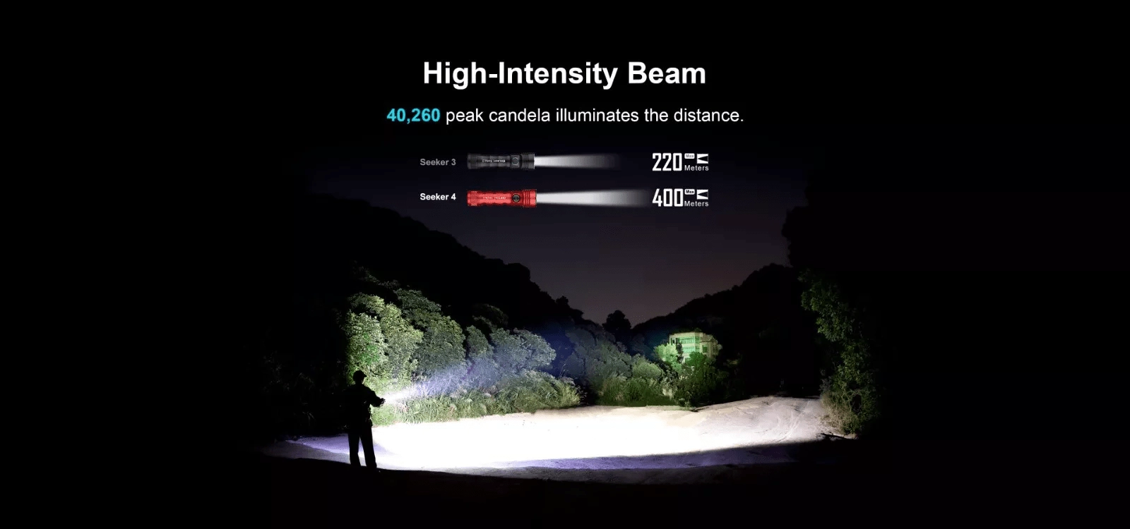 De hoge lichtintensiteit van 40.260 cd creëert een heldere, ronde lichtbundel die het pad veilig verlicht, ook op grotere afstand – ideaal voor outdooractiviteiten en interventies.