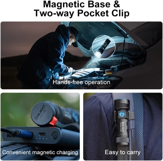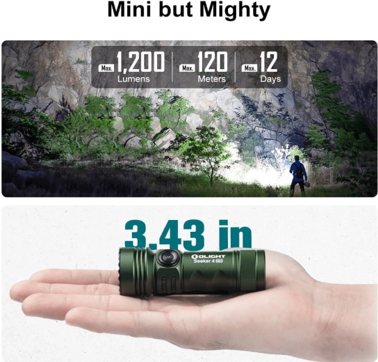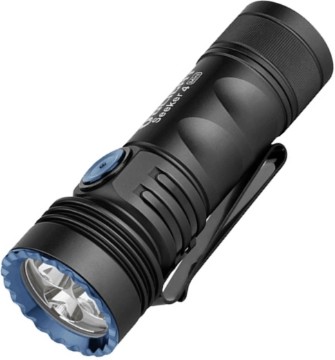 - Olight Seeker 4 Mini NW (met batterij en tweezijdige clip), polsriem, magnetische oplaadkabel MCC1A, gebruikershandleiding