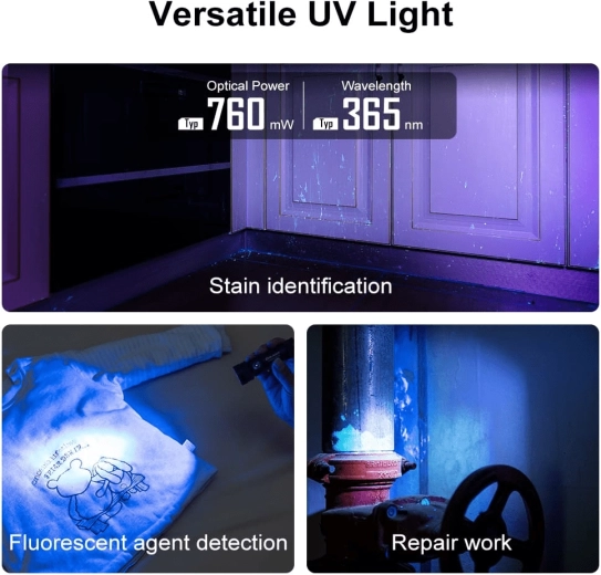 Eén lamp voor alles: een krachtige neutraal witte bundel voor dagelijks verlichten en UV 365 nm (760 mW) voor detectie van vervuiling, documentcontrole of het zoeken naar sporen.