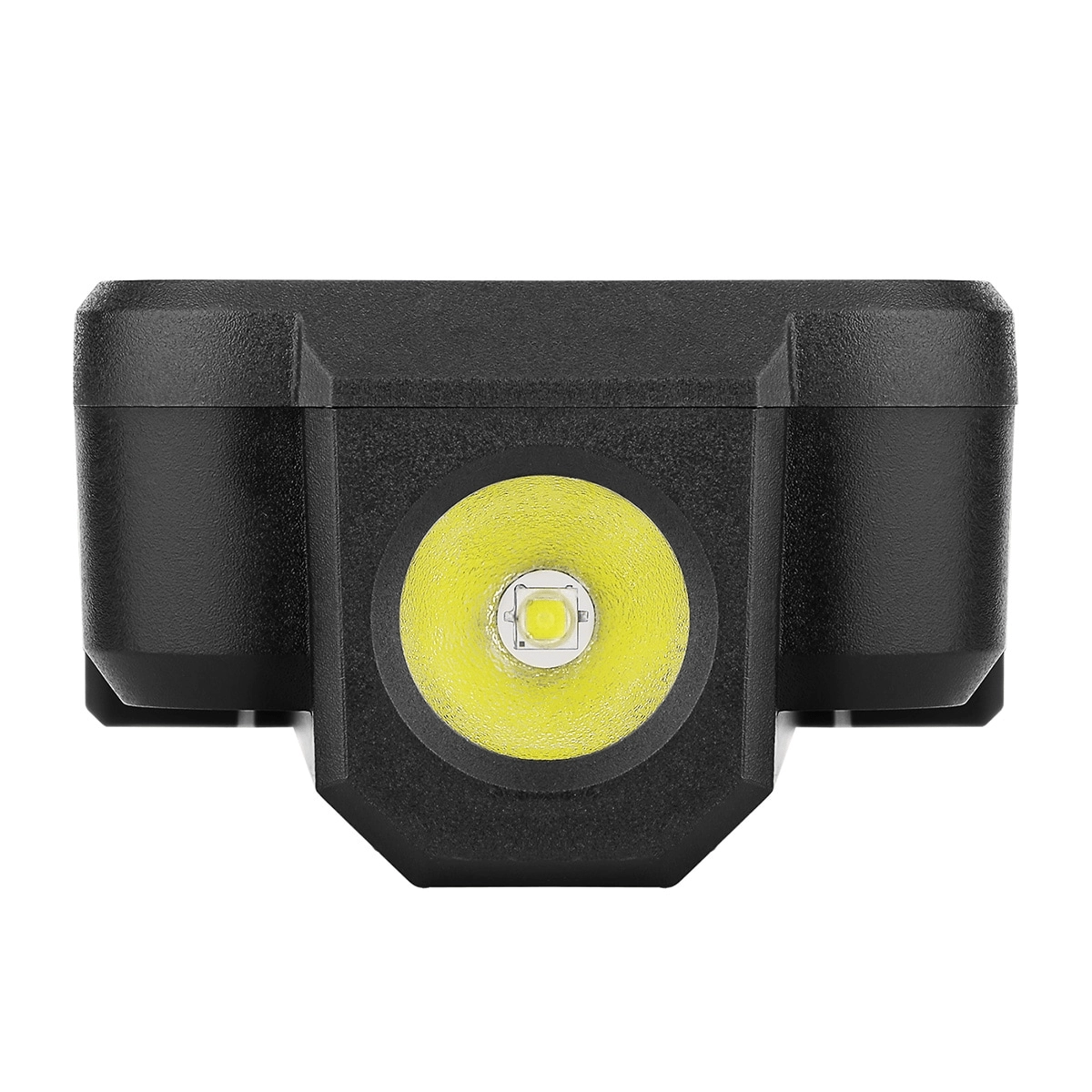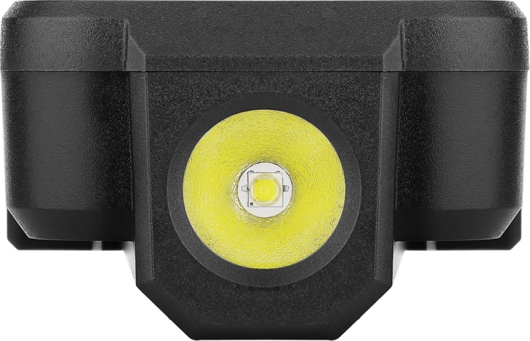 Breed COB‑paneel aan de voorzijde voor gelijkmatige verlichting van de werkruimte en een krachtige spot‑LED aan het uiteinde met een bereik tot 80 m voor precieze verlichting.