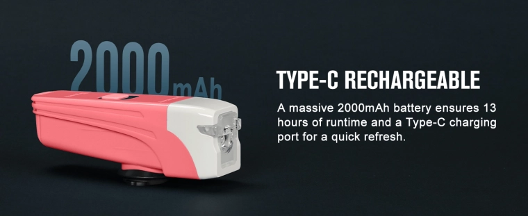 De geïntegreerde 3,7 V / 2000 mAh accu laadt in ongeveer 2,5 uur op en biedt tot 13 uur verlichting, afhankelijk van de modus.