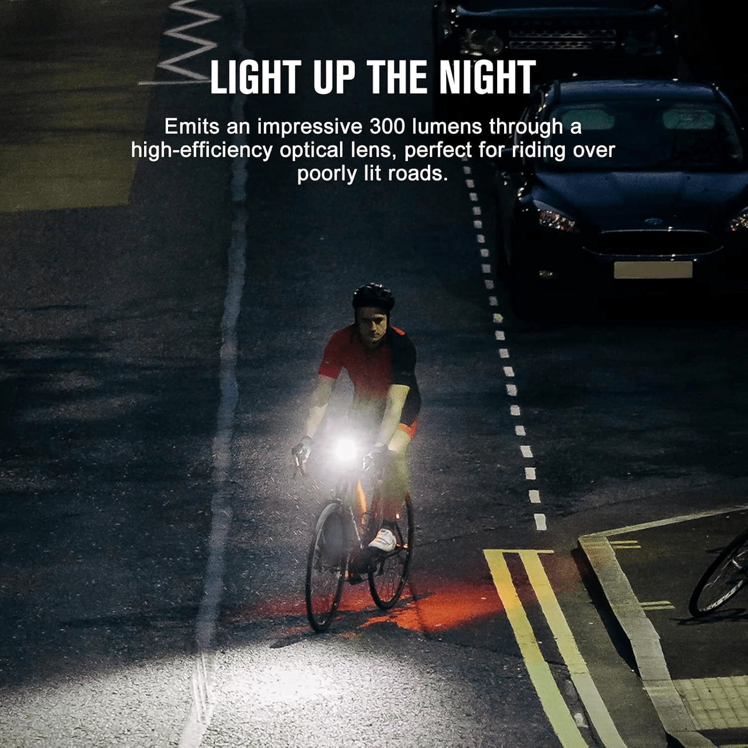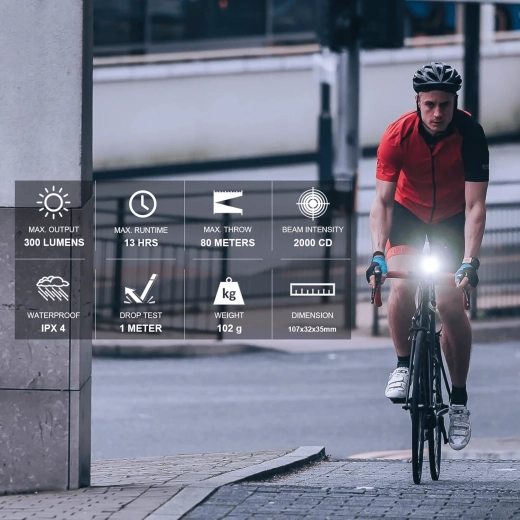 De high‑power LED levert tot 300 lumen en een reikwijdte van 80 m. Optiek met lage verblinding verhoogt de veiligheid in stadsverkeer en op de weg.