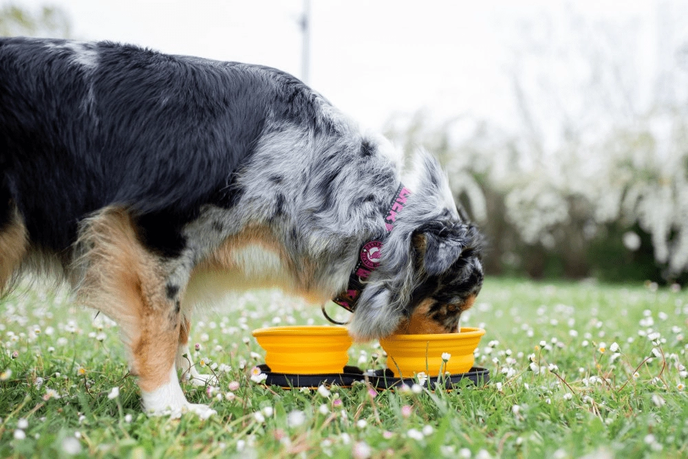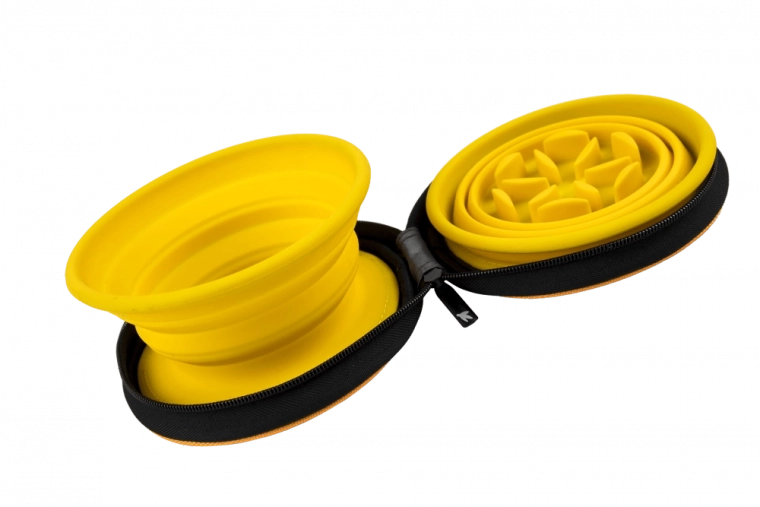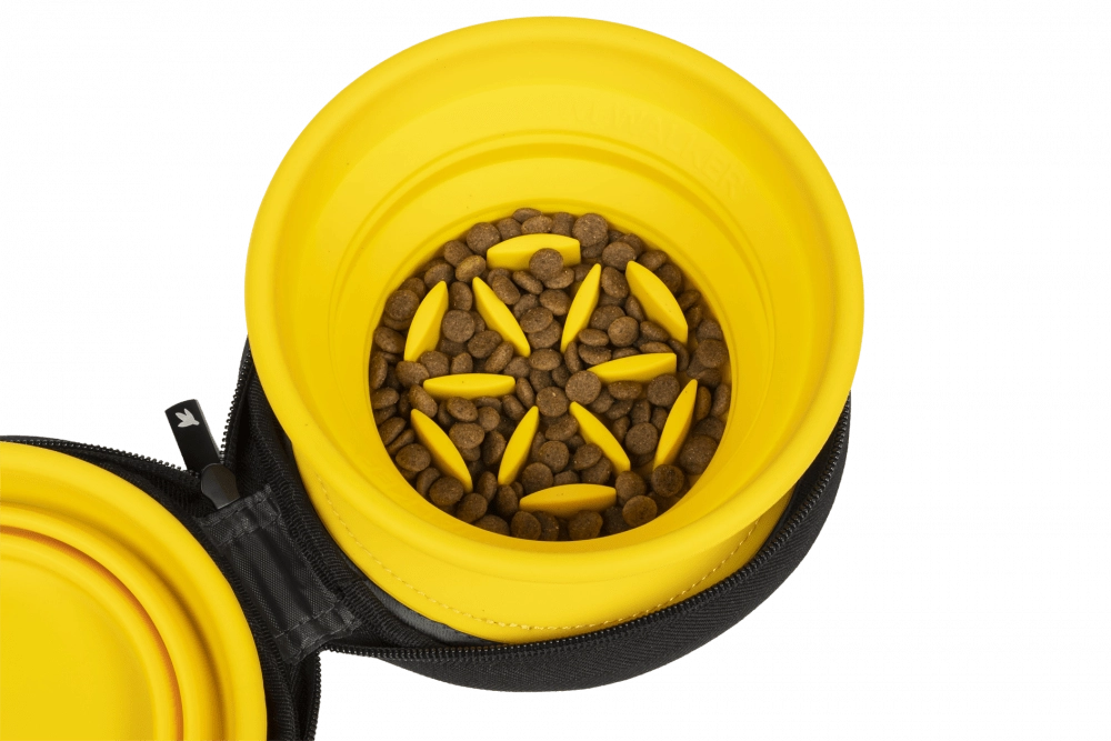 De speciale constructie van één kom werkt als slowfeeder, die schrokken vertraagt, betere spijsvertering ondersteunt en helpt winderigheid te voorkomen. De tweede kom is glad voor dagelijks gebruik. Beide zijn licht, duurzaam en gemakkelijk schoon te maken – ideaal voor uitstapjes, vakanties en dagelijks gebruik.