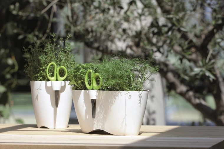 Praktische bloempot met schaar LIMES DUBLO in het wit, ideaal voor het thuis kweken van kruiden. Dankzij het dubbele design kweek je eenvoudig meerdere soorten tegelijk en met de geïntegreerde houder voor de schaar met drievoudig lemmet kun je kruiden comfortabel knippen tijdens het koken. Het duurzame kunststof materiaal met UV-bescherming is geschikt voor zowel binnen als buiten.