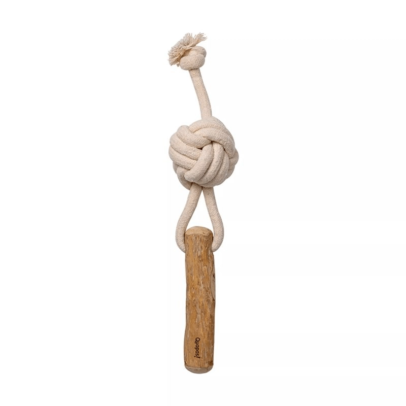 Interactief hondenspeelgoed Quapas! Shoot combineert een sterk katoenen touw en natuurlijk koffiehout voor veilig kauwen en trekspel. Het ondersteunt gezonde tanden en tandvlees, is duurzaam en gemaakt van duurzame materialen.