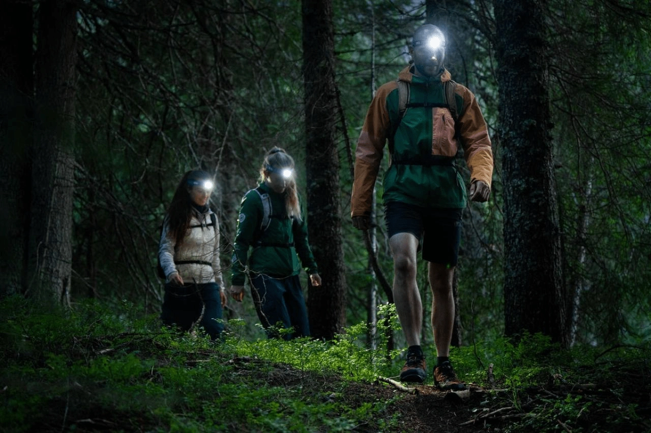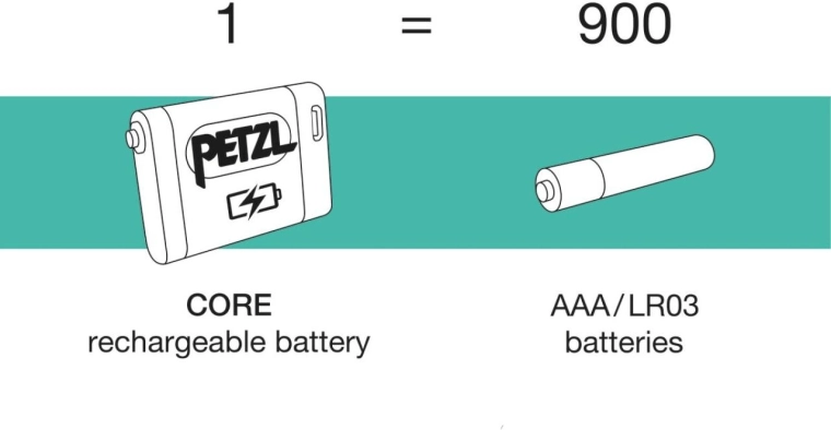 Inclusief CORE-accu (1250 mAh) met opladen via USB‑C. Ook te gebruiken met 3× AAA (niet inbegrepen); de hoofdlamp detecteert de bron automatisch en past het vermogen aan.