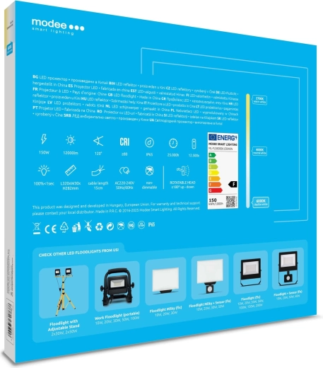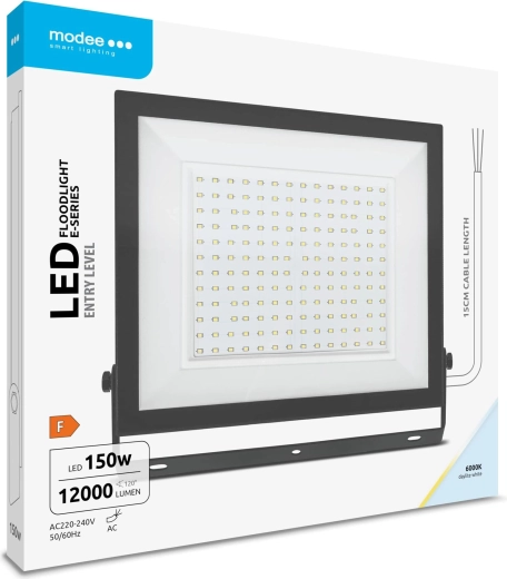 De krachtige outdoor LED‑schijnwerper Modee E‑series Slim biedt 150 W vermogen en tot 12000 lm voor heldere verlichting van grote oppervlakken. Dankzij de brede stralingshoek van 120°, IP65-bestendigheid en koelwit licht van 6000K is hij ideaal voor erven, opritten, magazijnen en industriële ruimtes. De stroomkabel van 15 cm maakt snelle en veilige installatie eenvoudig.