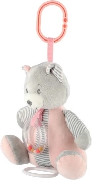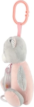 Dankzij de clip kan de beer eenvoudig aan een ledikant, kinderwagen of autostoeltje worden bevestigd.