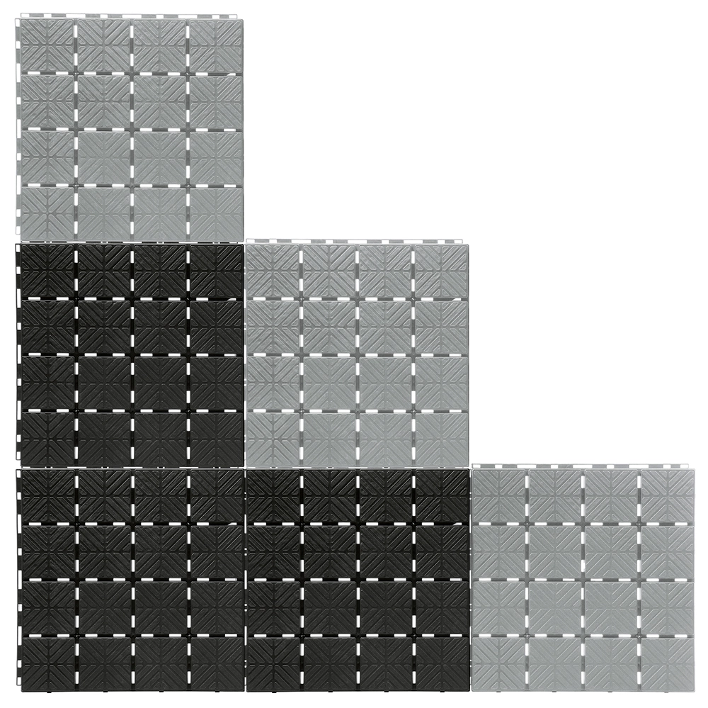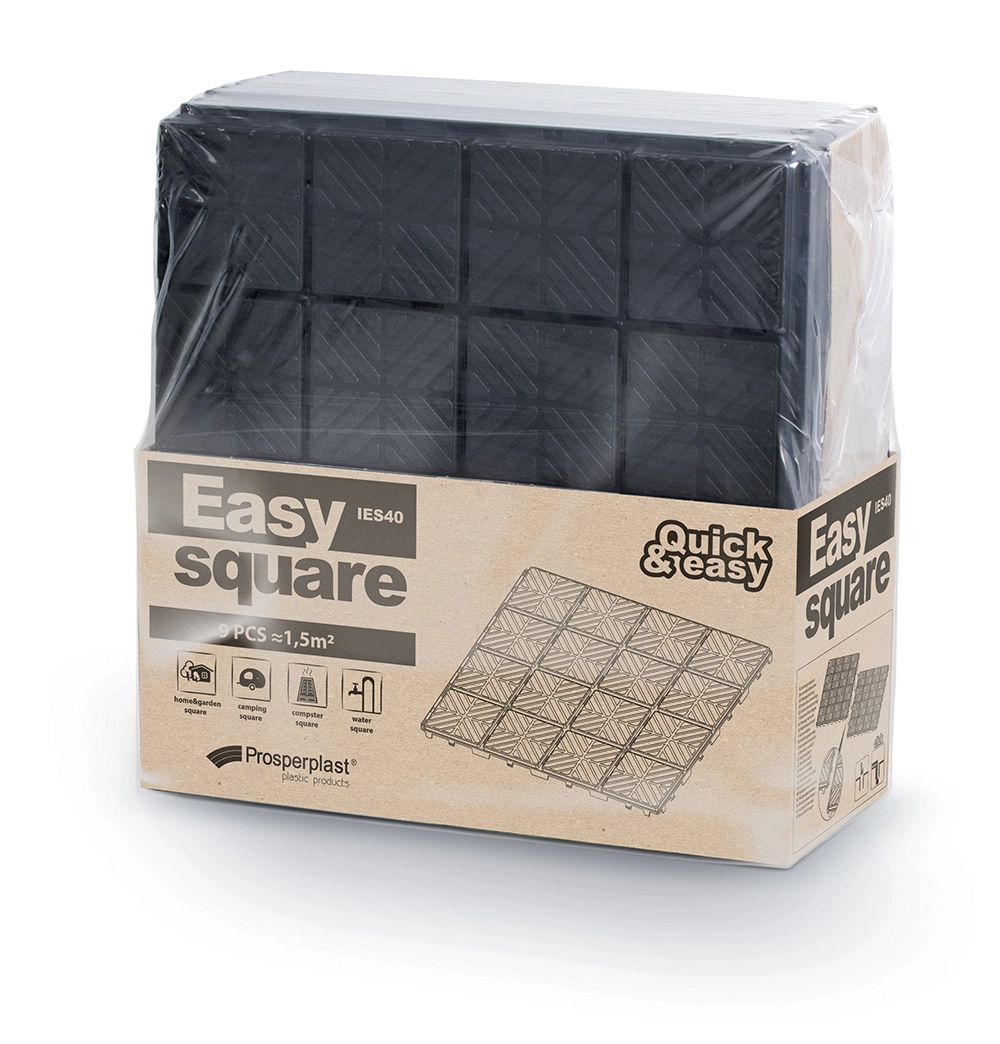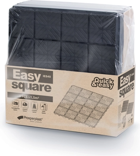 De modulaire tegels EASY SQUARE 40 × 40 cm zijn een veelzijdige oplossing voor terras, balkon, rond het zwembad en de garage. Dankzij het kliksysteem zijn ze snel te leggen en te demonteren, ze zijn anti-slip, vorstbestendig en bestand tegen vocht. Een verpakking van 9 stuks bedekt 1,5 m² en de zwarte kleur laat zich gemakkelijk combineren met elke stijl.