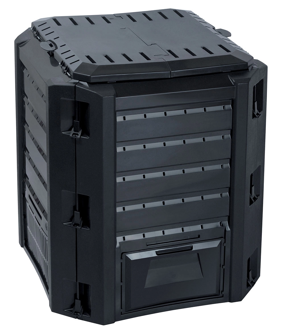 Het bovendeksel maakt snel toevoegen van materiaal mogelijk, het onderste serviceluik vervolgens het eenvoudige uitnemen van kant-en-klare compost voor de voeding van bloembedden, gazons en struiken. De composter heeft stevige kliksluitingen en een paneelconstructie voor snelle montage en stabiliteit. De elegante zwarte uitvoering gaat onopvallend op in het groen eromheen.