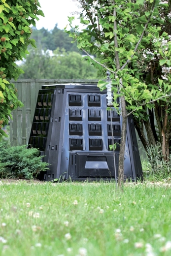 Eenvoudige bediening en onderhoud: bovenklep voor comfortabel vullen en onderste openingen voor het gemakkelijk afnemen van de rijpe compost. Dankzij de compacte afmetingen past hij ook in kleinere tuinen en stoort visueel niet – de elegante zwarte kleur gaat op in de omgeving.