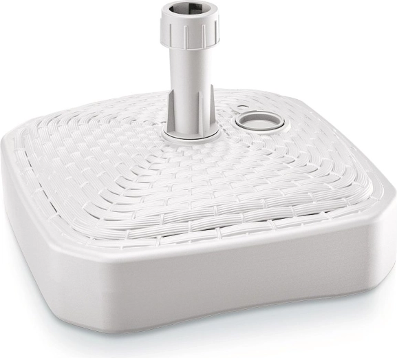 Praktische en elegante parasolvoet UMBRELLA met afmetingen 39 × 39 cm in witte kleur zorgt voor een stabiele steun voor uw parasol in de tuin, op het terras of balkon. Gemaakt van duurzaam kunststof met UV-bescherming, kan worden gevuld met water of zand tot 12 l en is compatibel met stokken met een diameter van 24–30 mm.