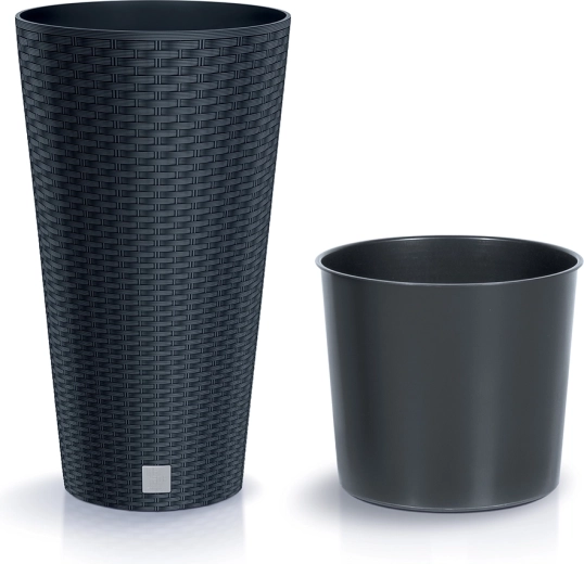 Elegante bloempot PROSPERPLAST Rato Tubus in antraciet combineert een modern rotanlook met praktische voordelen. Hij is licht, geschikt voor binnen en buiten en dankzij UV-bestendige kunststof blijft de kleur langdurig behouden. Inclusief binneninzet voor comfortabel planten en eenvoudig onderhoud.