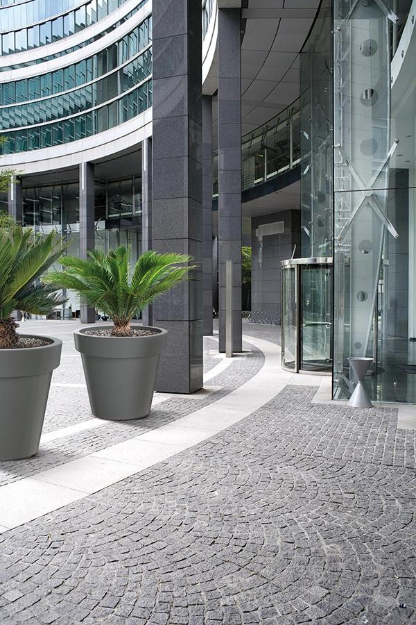 De elegante kegelvorm en het oppervlak in grijze steendecor accentueren entrees, terrassen en kantoorinterieurs, waar hij fungeert als een stijlvolle eyecatcher.
