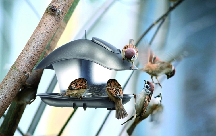 Stijlvol vogelvoederhuisje met een modern design en een duurzame constructie van kunststof en metaal. Transparante container voor eenvoudige controle van het voer, een schuin dak dat beschermt tegen regen en sneeuw en flexibele installatie met ophangen, bevestigen aan een leuning of plaatsen op een paal.