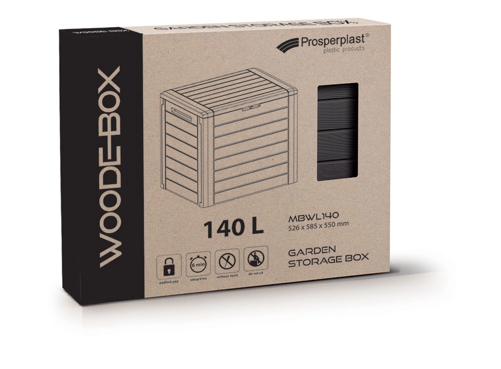 De praktische tuinbox WOODEBOX met een inhoud van 140 l is ideaal voor het opbergen van gereedschap, kussens, dekens en speelgoed. Hij biedt een duurzame kunststofconstructie, eenvoudige montage zonder gereedschap en een elegante houtlook in de tint umbra, die natuurlijk past in de tuin, op het terras en het balkon. Voor extra veiligheid is hij voorzien van de mogelijkheid tot vergrendeling met een hangslot en ventilatieopeningen tegen vocht.