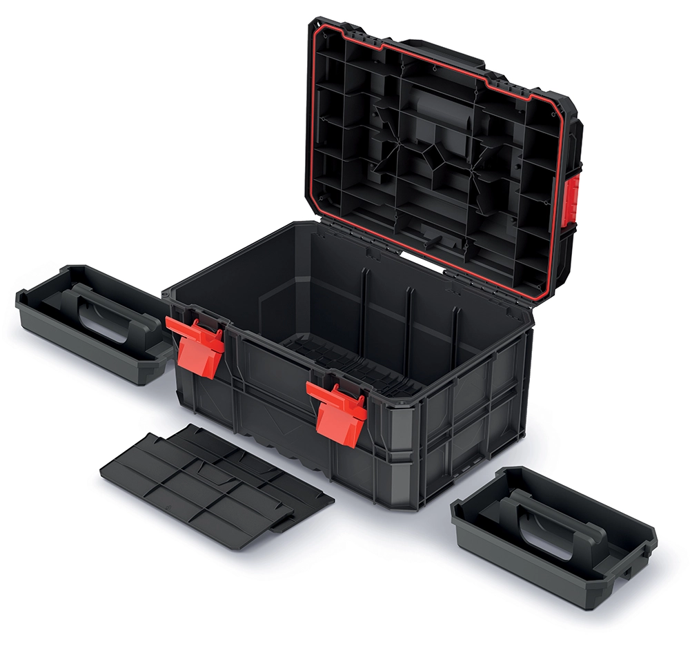 Professionele gereedschapskoffer uit de X-Block Pro-lijn met een modulair systeem voor veilige koppeling van boxen, hoge duurzaamheid en afdichting tegen stof en water. Dankzij de robuuste geribbelde constructie, een draagvermogen tot 50 kg en directe belasting van modules tot 120 kg is hij ideaal voor dagelijks werk in veeleisende omstandigheden.