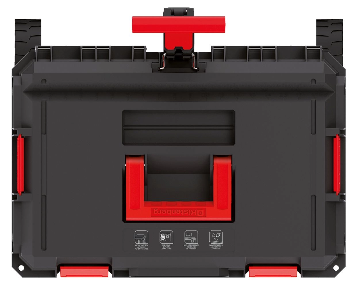 Grote terreinwielen en een telescoopgreep zorgen voor comfortabel verplaatsen, ook op oneffen ondergrond. Geïntegreerde aluminium geleiders in het deksel van geselecteerde modules maken van de koffer een stabiele werktafel. Directe belasting tot 120 kg maakt gebruik als opstap mogelijk, terwijl de interne organisatie gereedschap altijd binnen handbereik houdt.