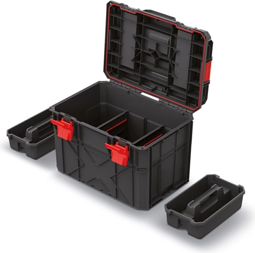 De X-BLOCK TECH gereedschapskoffer is ontworpen voor professionals die een betrouwbaar en modulair systeem nodig hebben voor zowel de werkplaats als de bouwplaats. De robuuste geribde constructie, afdichting tegen stof en water en krachtige sluitvergrendelingen houden uw gereedschap veilig, zelfs bij intensief gebruik. Aluminium rails in het deksel veranderen de koffer in een compacte werkruimte.
