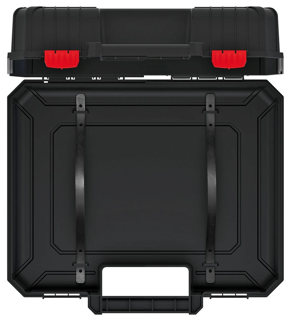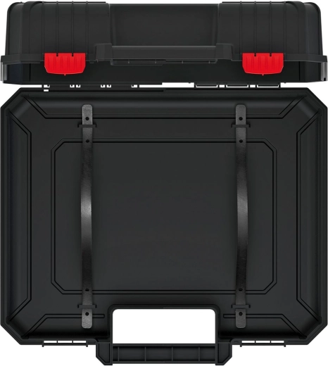 De Heavy gereedschapskoffer is een oplossing voor professionals en doe-het-zelvers die boren, slijpmachines, accu’s, laders en andere accessoires veilig moeten vervoeren. Twee robuuste interne riemen fixeren de uitrusting betrouwbaar, zodat alles op zijn plek blijft tijdens dragen en transport.