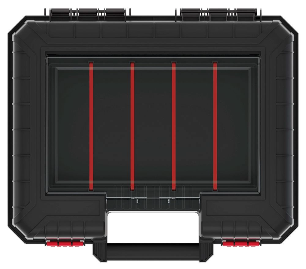 De bovenste organizer met helder deksel biedt direct overzicht over kleine componenten en accessoires zonder de koffer te hoeven openen.
