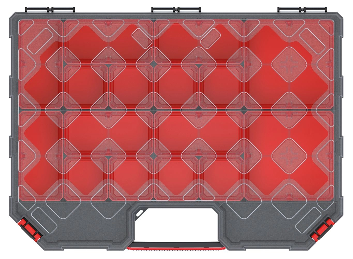 Transparante deksels bieden in één oogopslag zicht op de inhoud, terwijl stevige rode sluitingen de onderdelen ook tijdens transport veilig op hun plaats houden.