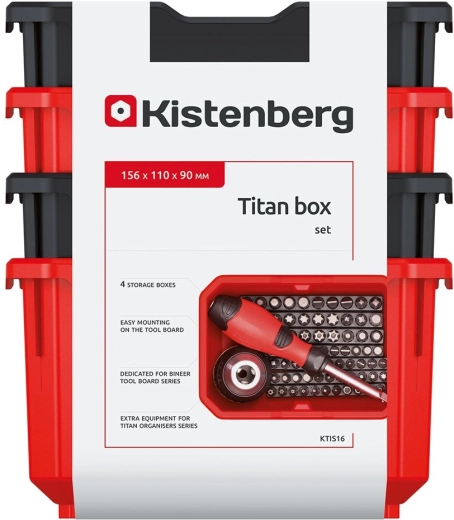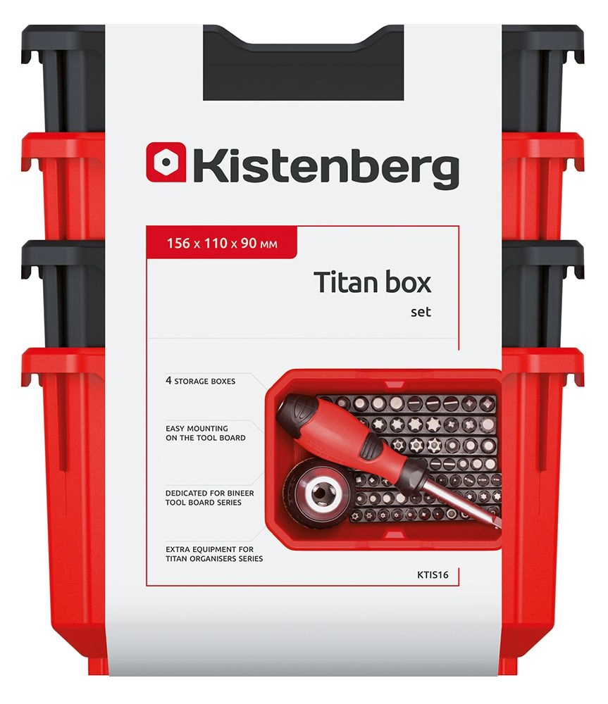 Kies een slimme oplossing voor het overzichtelijk opbergen van schroeven, pluggen, bits en ander klein gereedschap. De set van 4 TITAN BOX-bakken in zwart/rood biedt hoge duurzaamheid, stabiliteit en de mogelijkheid tot stapelen of ophangen aan geperforeerde platen of werkplaatspanelen. De brede voorrand vergemakkelijkt hantering en het uitnemen van de inhoud.