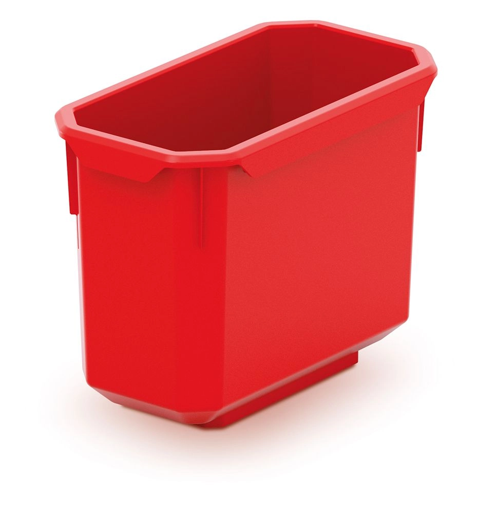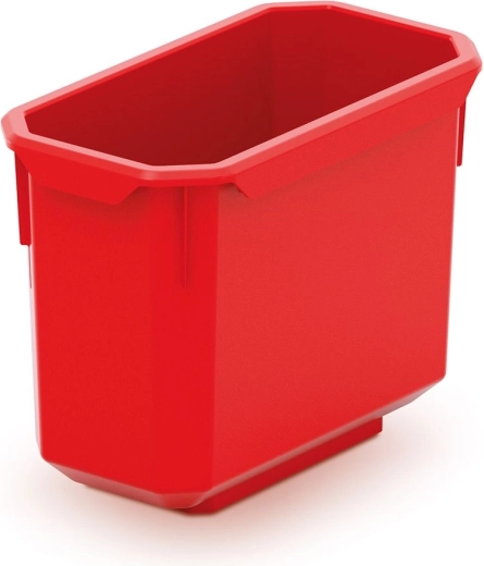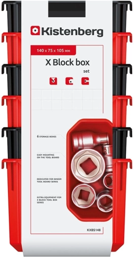 Praktische set van zes stevige opbergboxen KISTENBERG X Block in een combinatie van zwart en rood voor overzichtelijke sortering van klein materiaal. De boxen zijn stapelbaar, hebben open toegang voor snel uitnemen van de inhoud en maken eenvoudige montage op wandpanelen of plaatsing in stellingen mogelijk. Ideaal voor schroeven, pluggen, bits, moeren en andere kleine onderdelen in werkplaats, garage of huishouden.