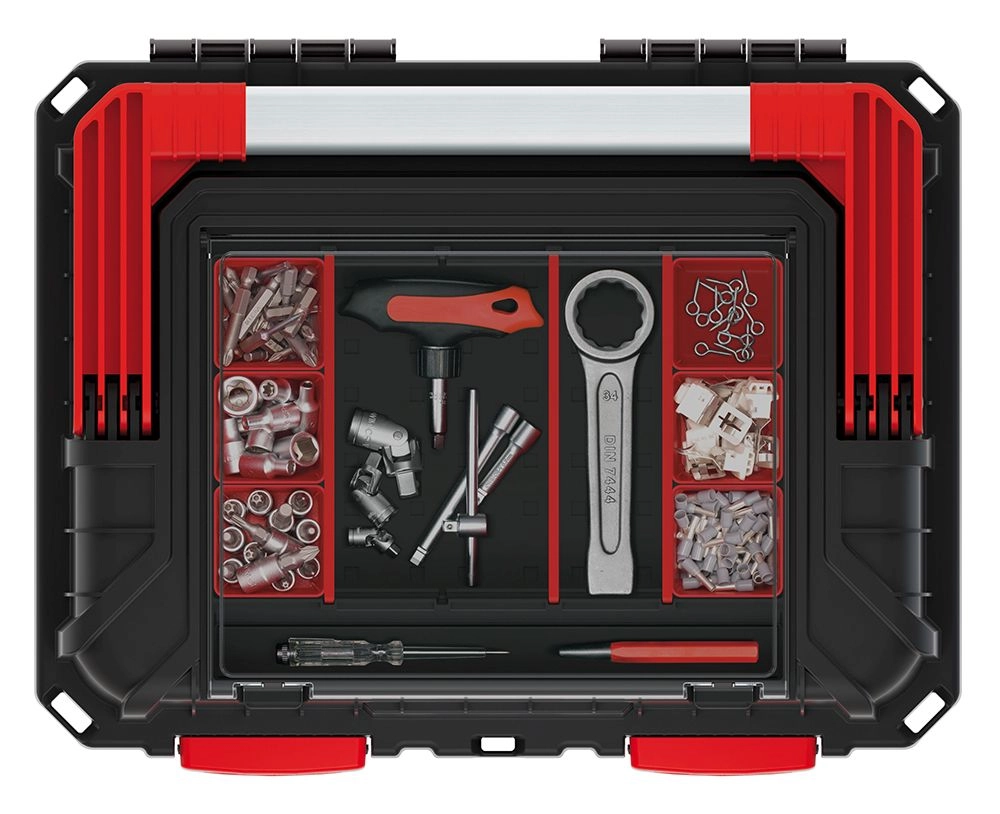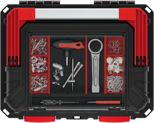 De interne indeling met een uitneembare inzet helpt bij het sorteren van schroevendraaiers, tangen en klein materiaal. Het buitencompartiment biedt directe toegang tot de meest gebruikte items, zoals bits, pluggen of een meetlint. De praktische afmetingen 445 × 360 × 337 mm bieden voldoende ruimte en behouden toch goede draagbaarheid.