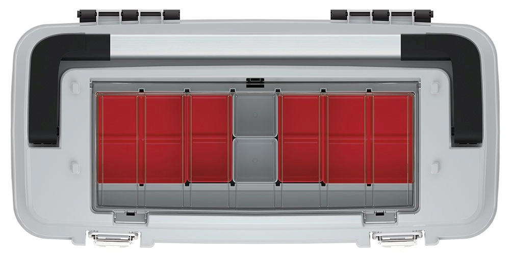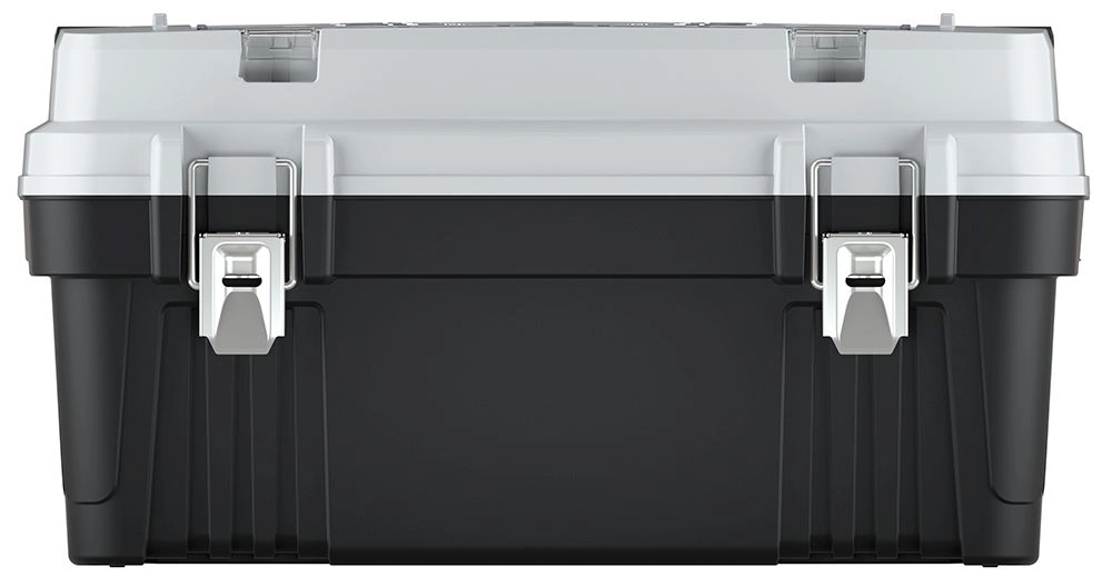 Het afsluitbare externe vak met doosjes versnelt het werk: schroeven, pluggen en bevestigingsmateriaal hebt u direct bij de hand. Metalen sluitingen zorgen voor veilig afsluiten en de metalen handgreep voor een comfortabele en zekere grip, ook bij hogere belasting. Er is tevens een uitneembare inzet voor flexibele indeling inbegrepen.