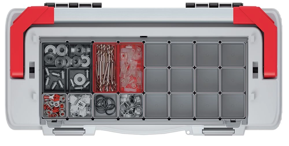 Het afsluitbare bovenvak met bakjes maakt gescheiden opslag van schroeven, pluggen, bits en andere accessoires mogelijk – alles zichtbaar en snel toegankelijk.