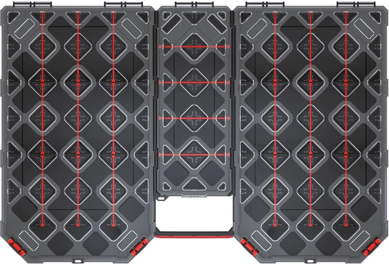 Dankzij de slimme indeling met uitneembare tussenschotten past u de binnenruimte eenvoudig aan uw actuele behoeften aan. De organizer is geschikt voor schroeven, moeren, houtschroeven, pluggen, bits, elektrische connectoren en ander klein materiaal. De robuuste behuizing en betrouwbare sluiting houden de inhoud veilig op zijn plaats, ook tijdens transport.