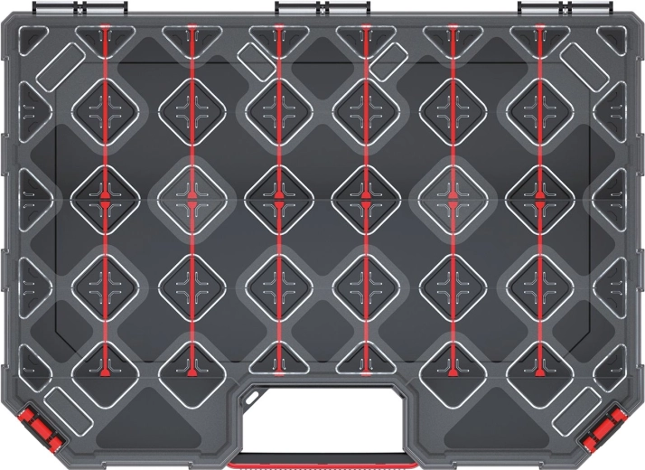 Dankzij de compacte afmetingen van 390 × 284 × 105 mm past de organizer eenvoudig in de werkplaats, auto of montagekoffer. Kwalitatieve sluitingen houden het deksel stevig gesloten en de stevige behuizing beschermt de inhoud tijdens het transport. Ideaal voor professionals en doe-het-zelvers die orde, overzicht en een lange levensduur van hun uitrusting eisen.