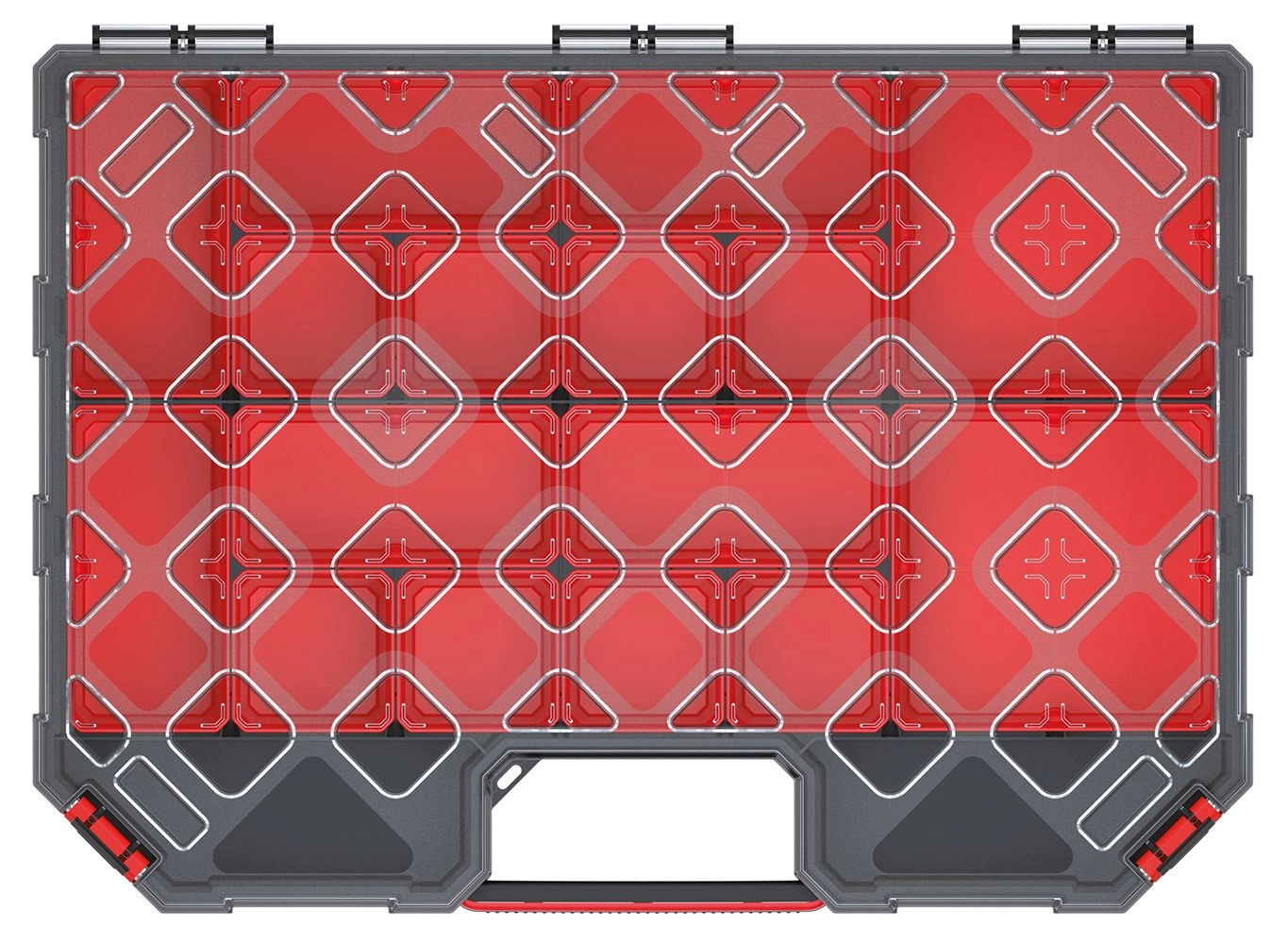 De hoge organizer TAGER CARBO PLUS is een ideale keuze voor werkplaats, garage en huishouden. Dankzij het polycarbonaat deksel is de inhoud altijd zichtbaar, terwijl de robuuste behuizing de opgeborgen onderdelen tegen beschadiging beschermt. Het formaat 390 × 284 × 105 mm biedt royale ruimte voor diverse soorten accessoires.
