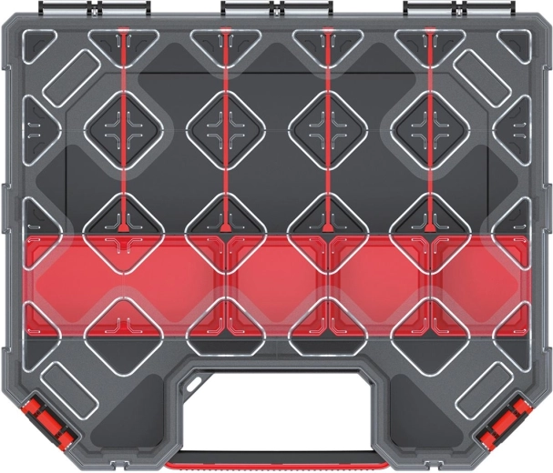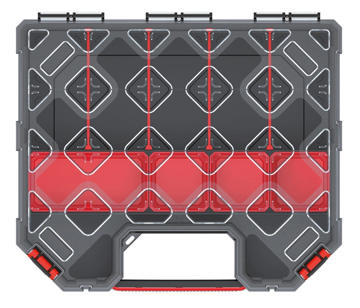 Praktische en duurzame organizer voor gereedschap, bevestigingsmateriaal en kleine onderdelen. Dankzij het transparante polycarbonaat deksel hebt u altijd zicht op de inhoud, aanpasbare schotten zorgen voor orde en het hoge design biedt voldoende ruimte, ook voor grotere delen.