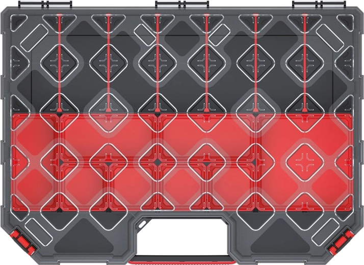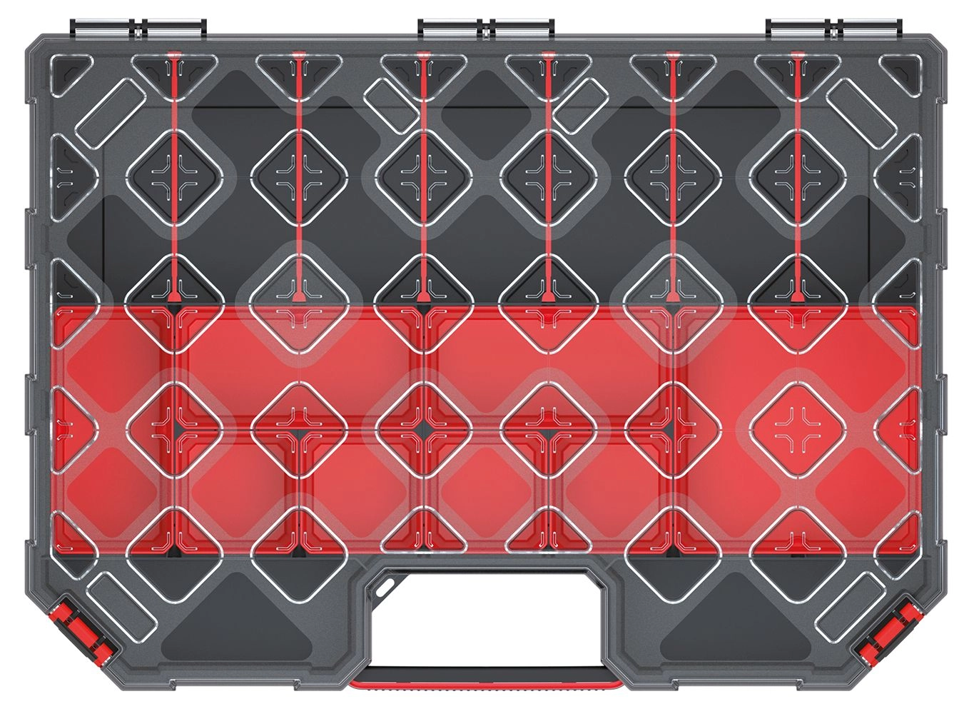 Dankzij de variabele tussenschotten creëert u eenvoudig uw eigen indeling van vakken precies zoals u nodig heeft. De organizer is geschikt voor zowel professionals als doe-het-zelvers die orde willen houden in materiaal en accessoires.