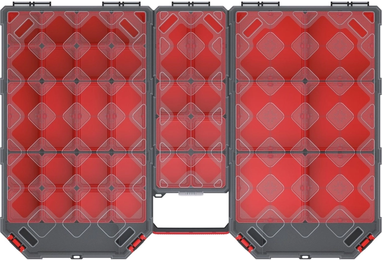De stevige constructie is ontworpen voor dagelijks gebruik en eenvoudige handling. De organizer is geschikt voor schroeven, pluggen, bits, elektrische componenten en andere kleinigheden die u overzichtelijk gesorteerd wilt houden.